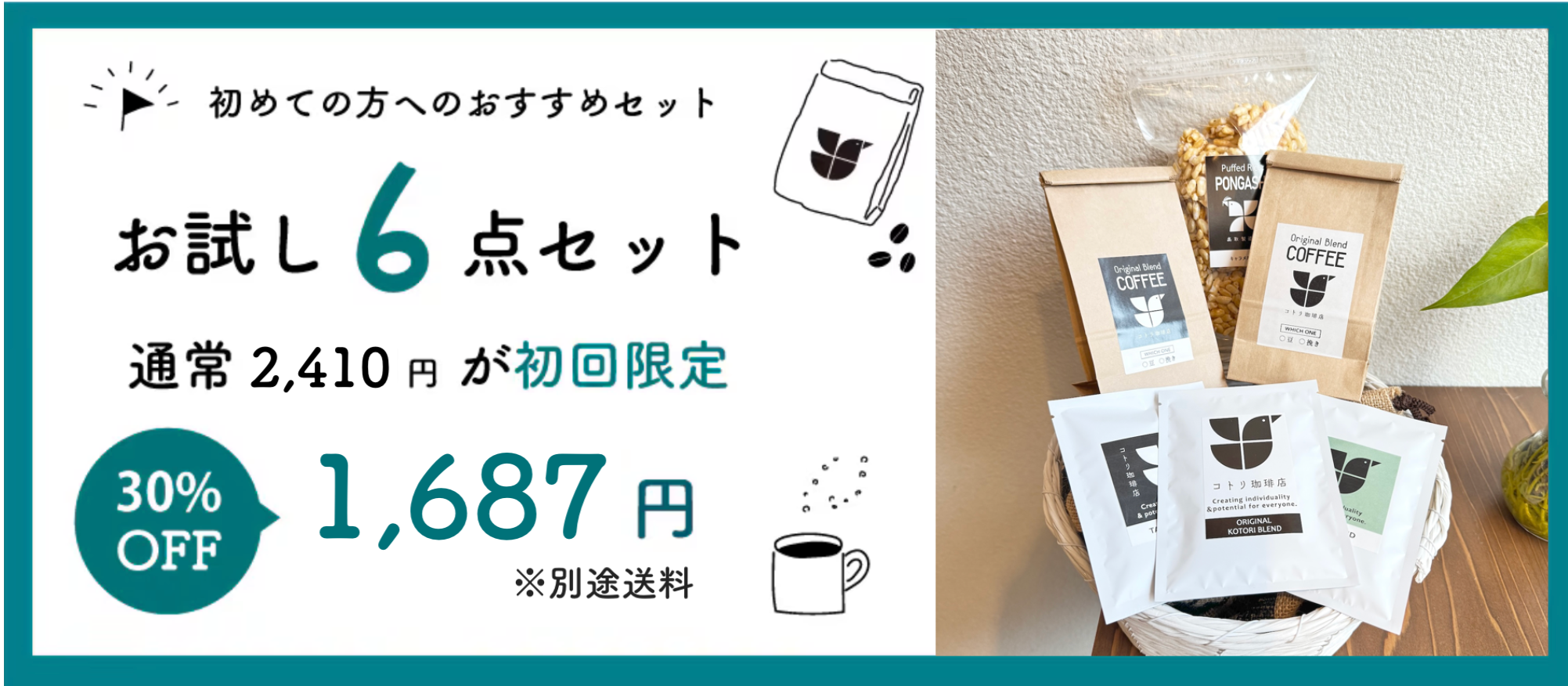 お得なお試しセット【お一人様 1回のみ有効、1セット限定】 通常6点で2,240円 → 30%offの 1,568円 ★別途送料[60サイズとなります。※他にも商品を追加される場合は80サイズ〜] ぜひ、こちらでお気に入りの味を見つけてください。 ◎セット内容 ●コーヒー豆2種類 [コトリブレンド、高取ブレンド各100g] ●ドリップパック 3パック [高取ブレンド×1、コトリブレンド×1、プレミアムブレンド×1] ●キャラメルぽん(キャラメル味) 1袋